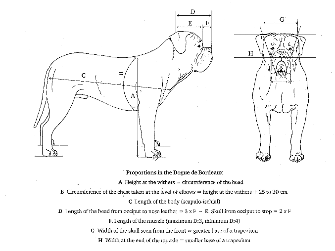 | General Appearance: | Typical concave lined brachycephalic mollossoid [short-headed Mastiff type]. The Dogue de Bordeaux is a very powerful dog, with a very muscular body yet retaining a harmonious general outline. He is built rather close to the ground, the distance sternum to ground being slightly less than the depth of the chest. Stocky, athletic, imposing, he has a very dissuasive aspect. Important Proportions: The length of the body, measured from the point of the shoulder to the point of the buttock, is superior to [greater than] the height at the withers, in the proportion of 11:10. The depth of the chest is more than half the height at the withers. The maximum length of the muzzle is equal to one third of the length of the head. In the male, the perimeter [circumference] of the skull corresponds, more or less, to the height at the withers. |